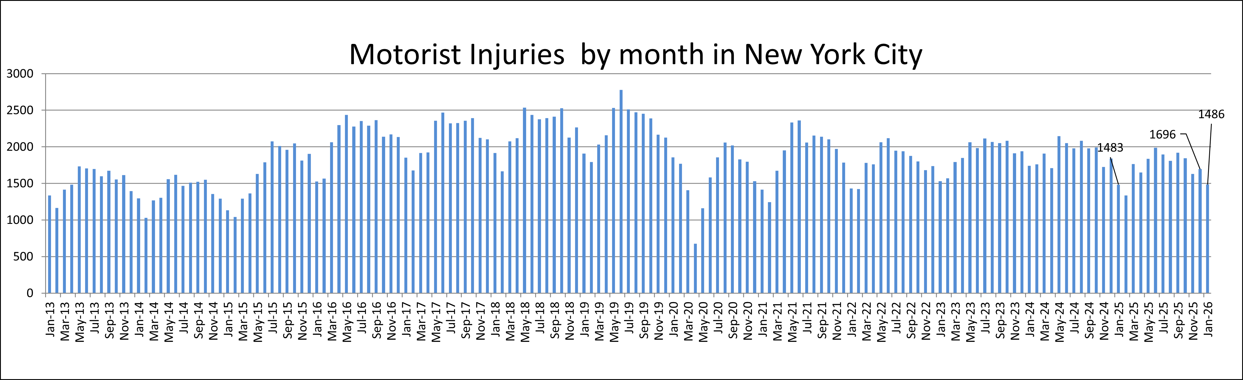 A total of 1,486 motorists were injured in traffic crashes in New York City in January 2026, compared to 1,696 in December 2025 and 1,483 in January 2025. The chart shows that motorist injuries have fluctuated over the past decade, typically ranging between about 1,400 and 2,400 per month, with January 2026 falling toward the lower end of that range and reflecting a decline from the previous month.