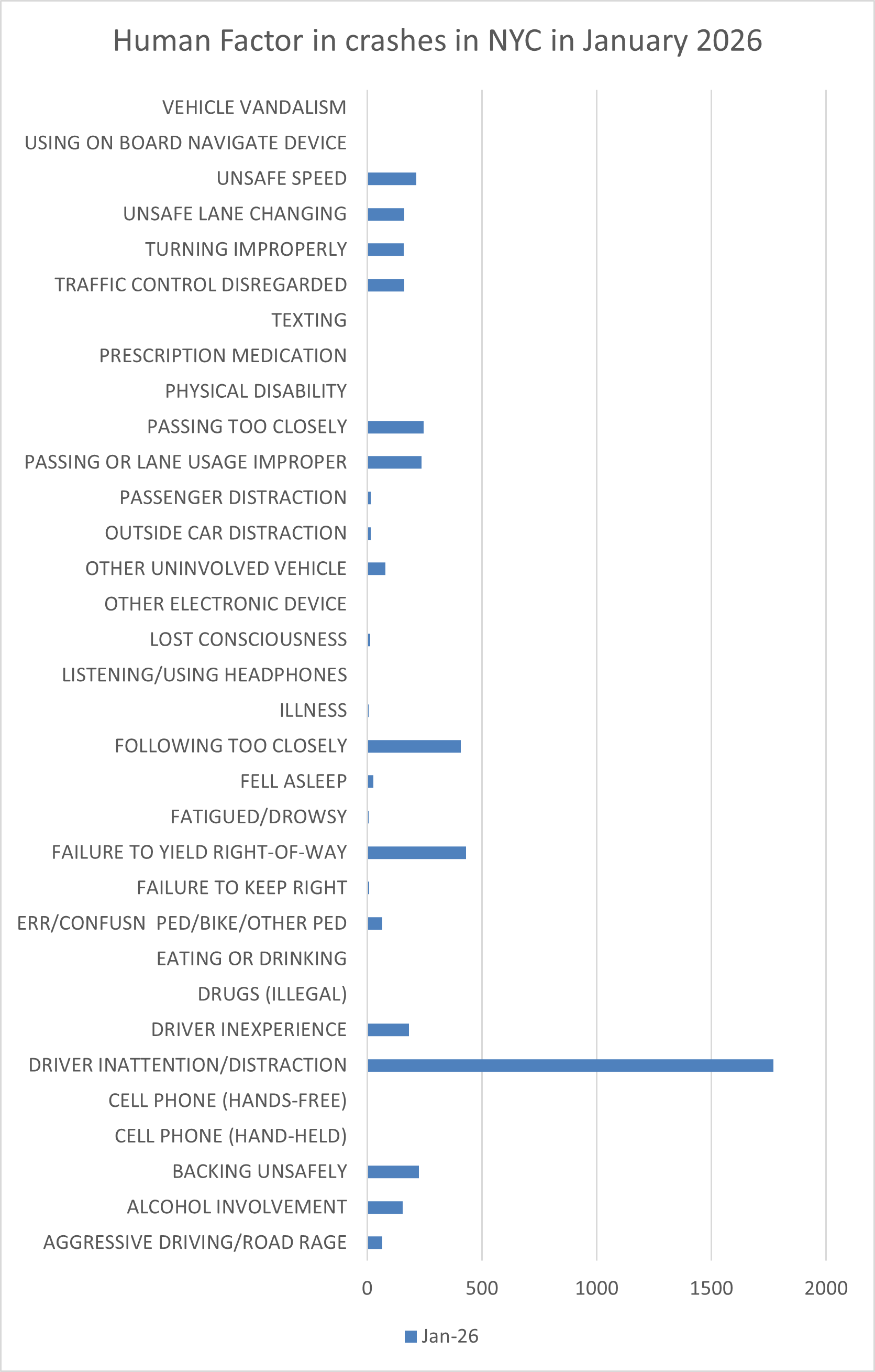 Drivers’ behavior continues to play a major role in traffic crashes in New York City. In January 2026, driver inattention or distraction was by far the most frequently cited contributing factor, appearing in a significantly higher number of crashes than any other human factor. Other common contributing behaviors included failure to yield the right of way, following too closely, unsafe speed, and improper passing or lane usage, all of which are associated with driver decision-making and situational awareness.