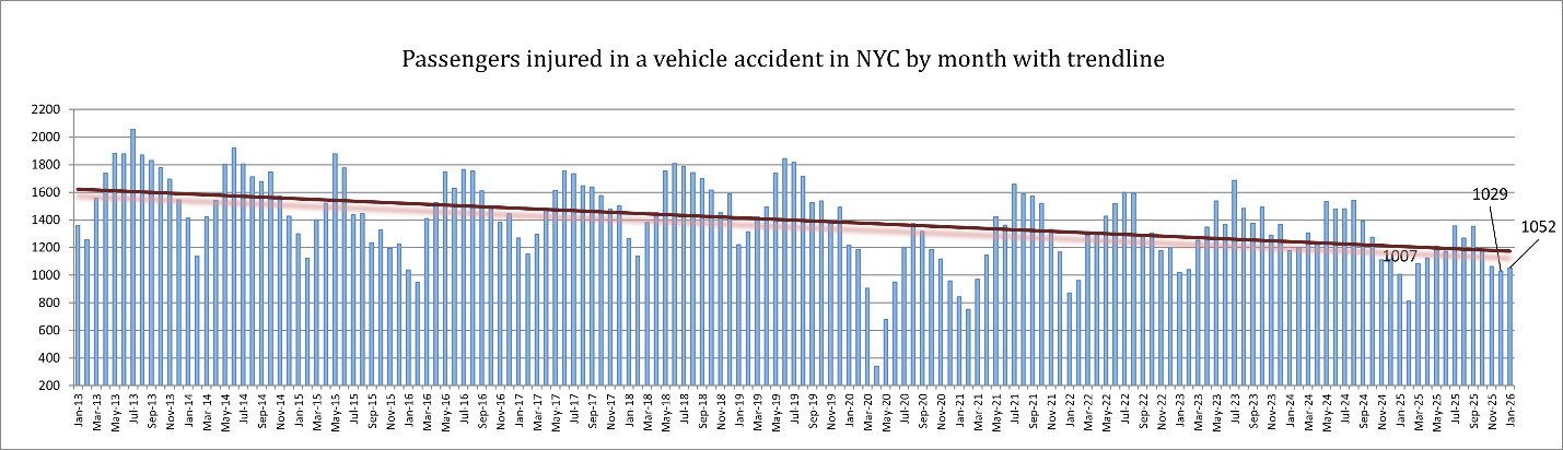 Passenger injuries in New York City traffic crashes have generally declined over the past decade, as reflected by the downward trendline in the chart. In January 2026, 1,052 passengers were injured, compared with 1,029 in December 2025 and 1,007 in January 2025, placing the month within the lower range of recent passenger injury totals.