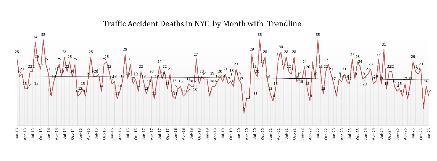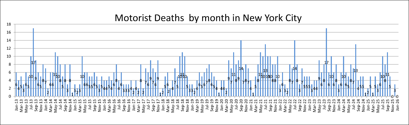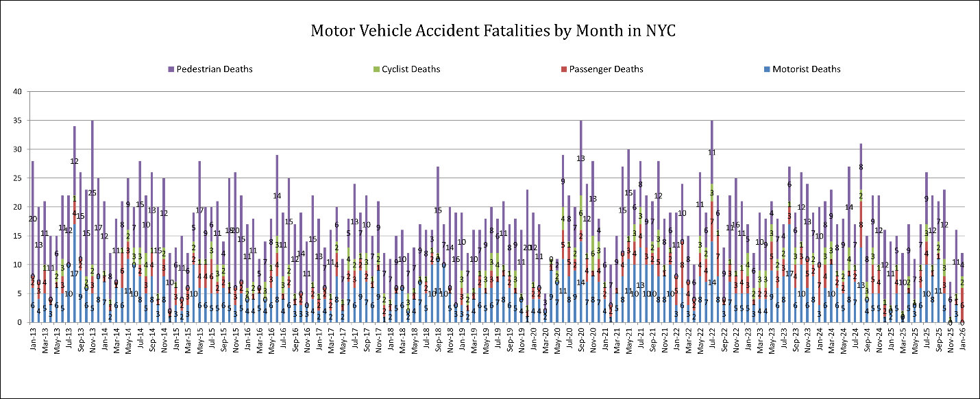 No Motorist killed in January 2026Motorist fatalities in New York City typically fluctuate from month to month, most often ranging between 3 and 8 deaths, with occasional spikes above that level. In January 2026, however, no motorists were killed in traffic crashes, making it an unusual data point compared to the historical pattern shown in the chart. Most months over the past decade have recorded at least several driver deaths, so the absence of motorist fatalities in January likely reflects reduced travel during the extreme cold and snowy weather that affected the city during the month. This also reinforces the broader trend that drivers generally account for fewer traffic fatalities than more vulnerable road users such as pedestrians and cyclists.