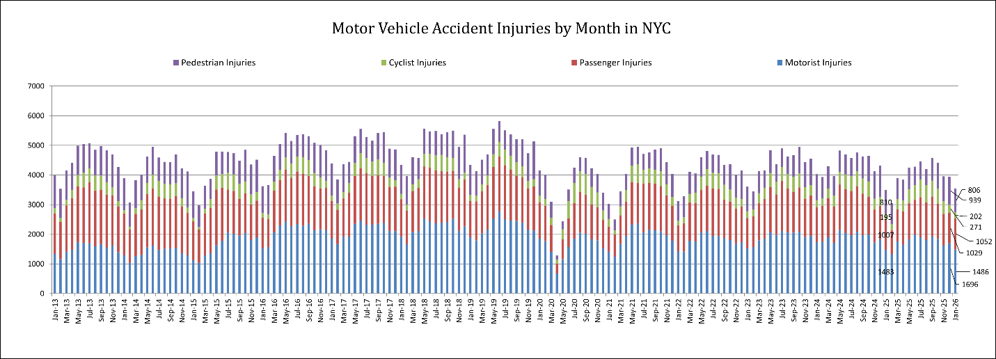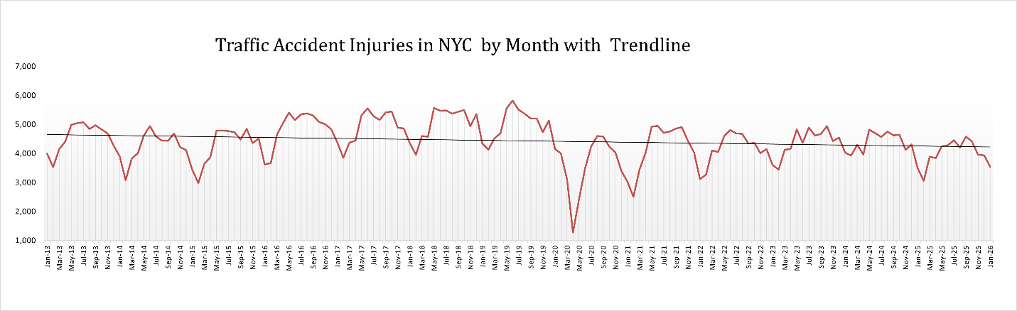 Overall, while traffic injuries declined compared to December, the long-term trendline shown in the chart suggests that monthly injury totals in New York City have remained relatively stable in recent years, typically fluctuating between 3,500 and 5,000 injuries per month depending on seasonal conditions and traffic activity.